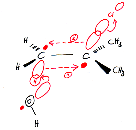 Die E2-Reaktion erfolgt konzertiert und erzeugt dabei eine Bewegung der Oribtallappen im Molekül, so dass auf der gegenüberliegenden Seite des Moleküls schon aufgrund der Orbitalverschiebungen die Abgangsgruppe leicht abgespalten werden kann, wie folgendes Schaubild verdeutlicht: